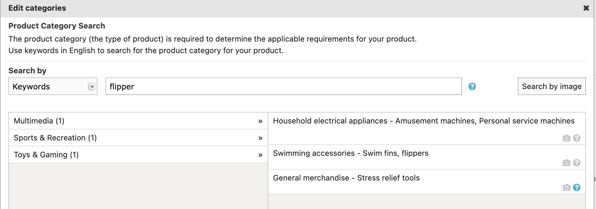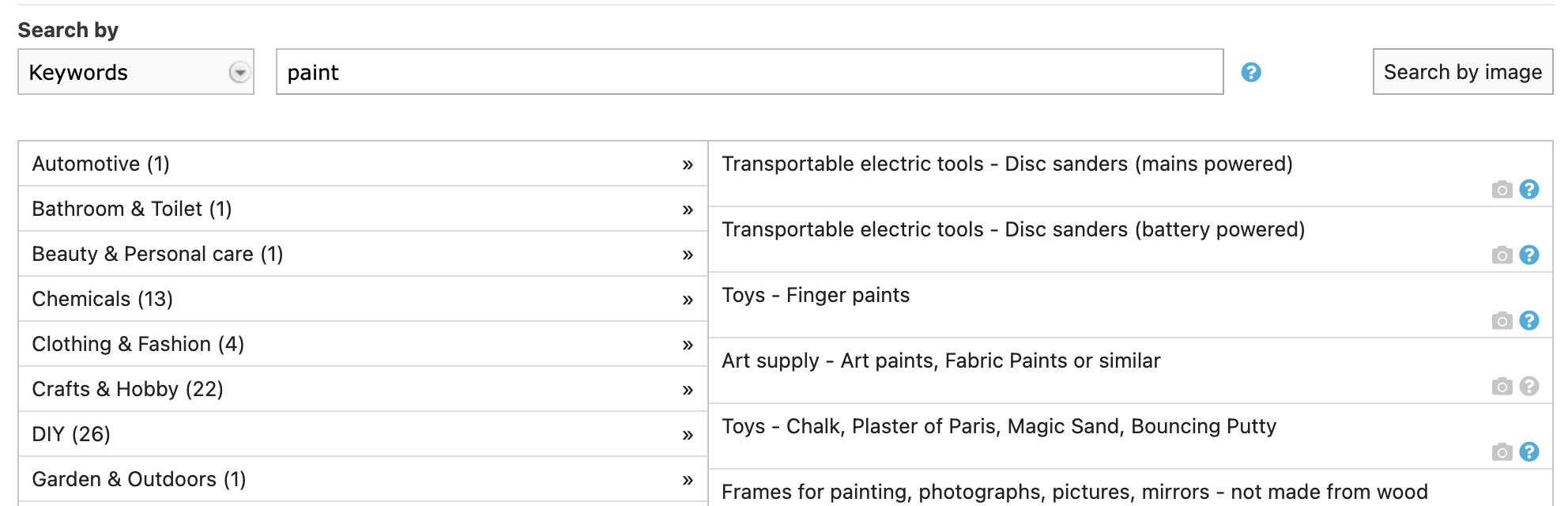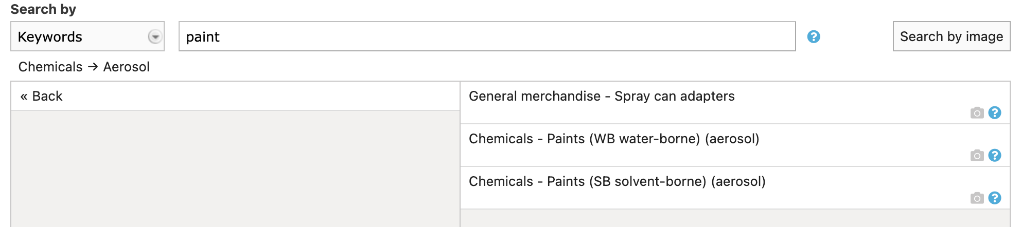 If multiple results appear, refine your search by choosing a subgroup (e.g., Chemicals > Aerosol). Hover over blue question mark for category details. When unsure, cross-check your selection using Google or an existing product file.