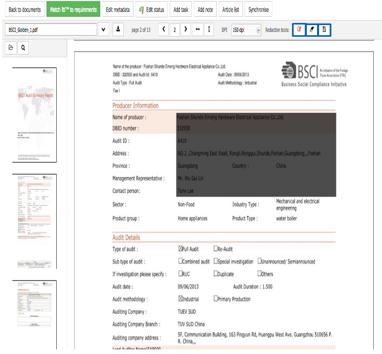 When sharing a Technical File with your business partners, it’s common to hide confidential details, such as supplier information. ProductIP automatically hides supplier details stored in the system, but information inside uploaded documents must be redacted manually.